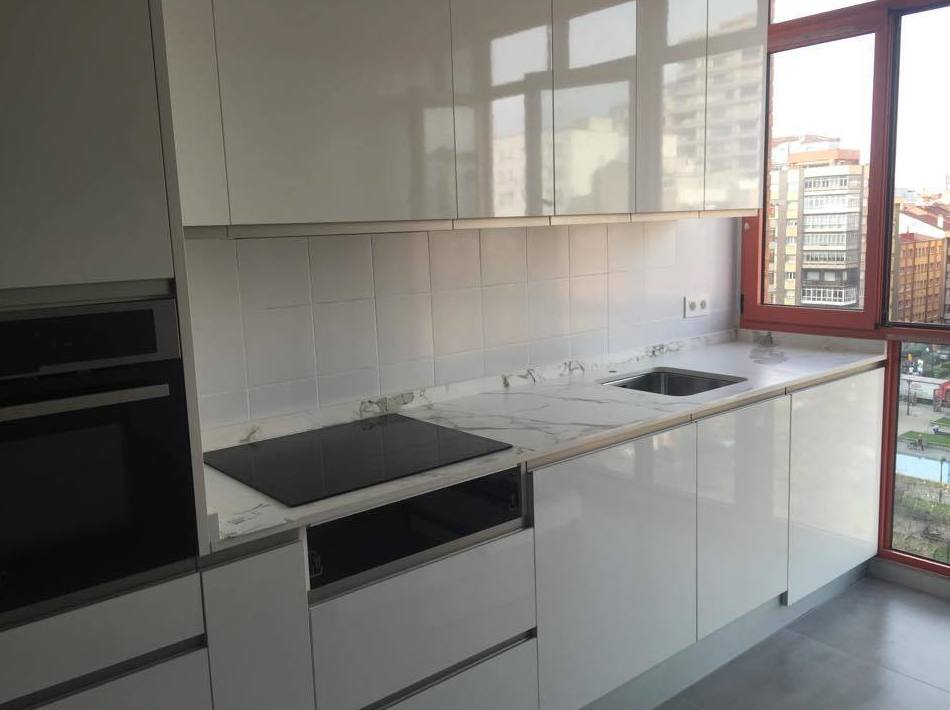 Cocina con puerta en Blanco brillo con tirador incorporado en puerta.Encimera Dekton Aura.
