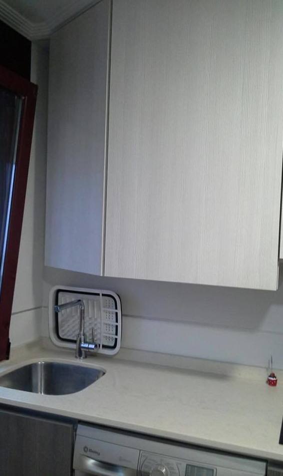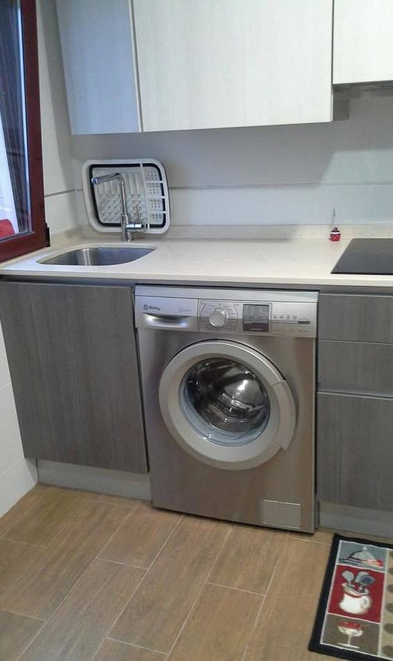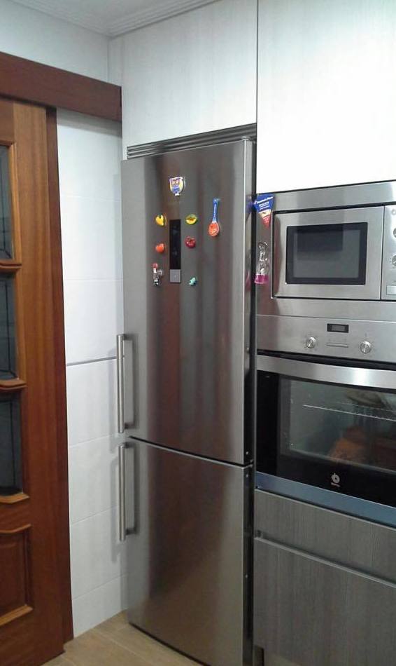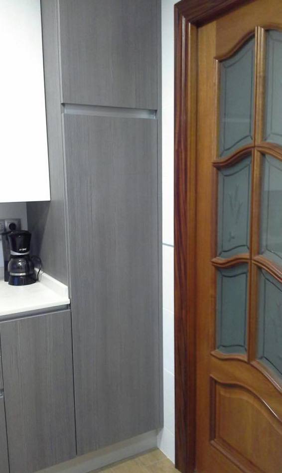 Cocina sin tiradores, en sistema gola, un poco especial con muebles altos más grandes para mantener la línea.