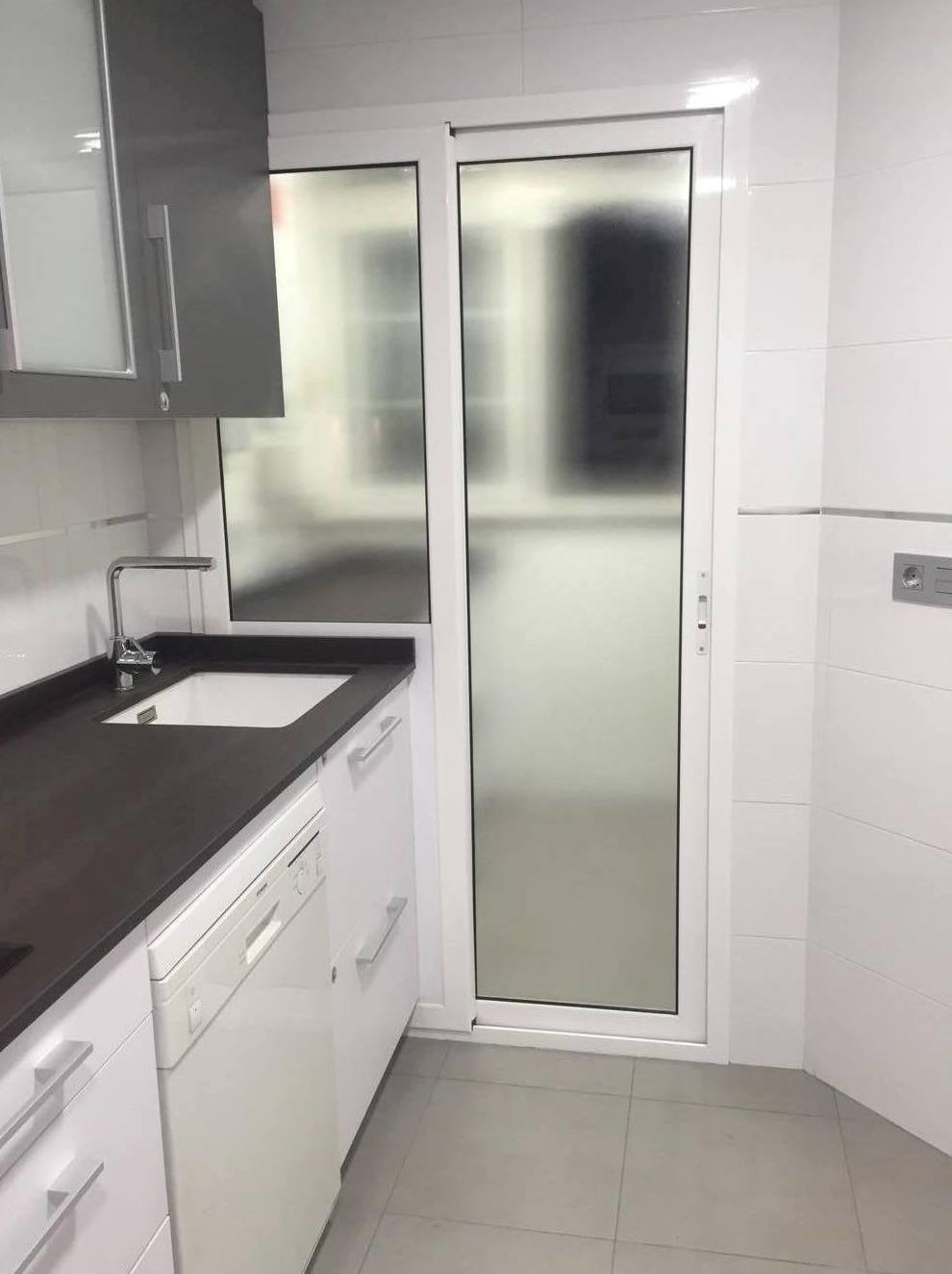 - Puerta de Aluminio corredera con una parte ciega y el resto con un vidrio Carglass new que deja pasar la luz perfectamente suministrada y montada por Alupex.
