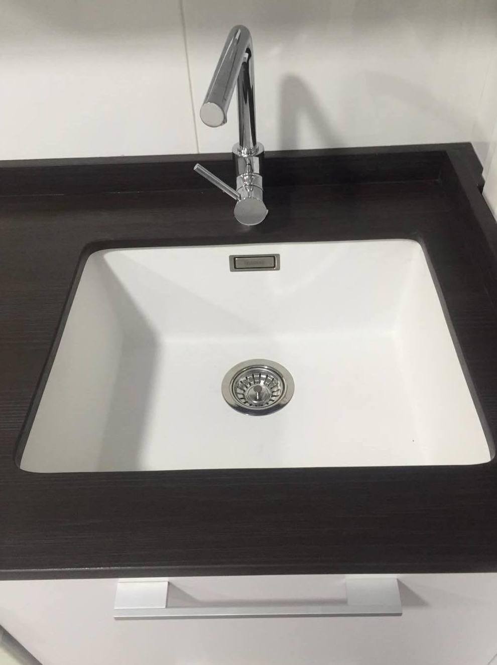- Fregadero de Blanco de Silgranit bajo encimera color blanco haciendo contraste con la encimera y grifo modelo Mila de la misma marca.